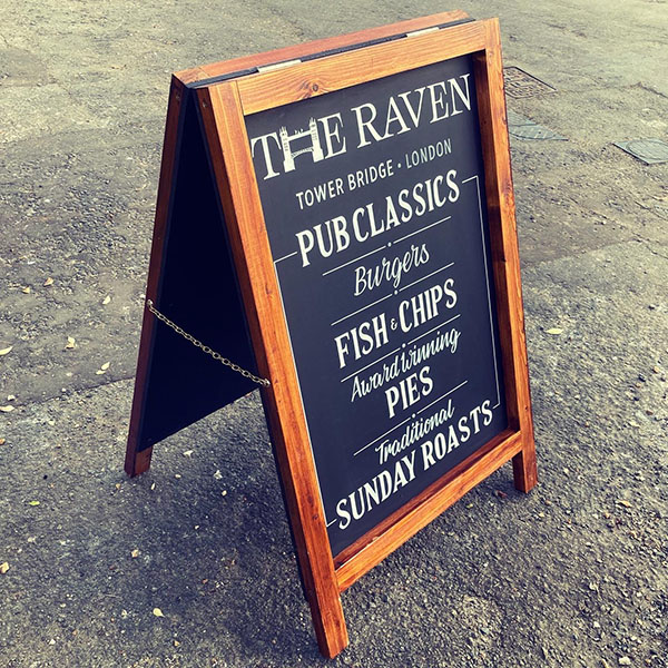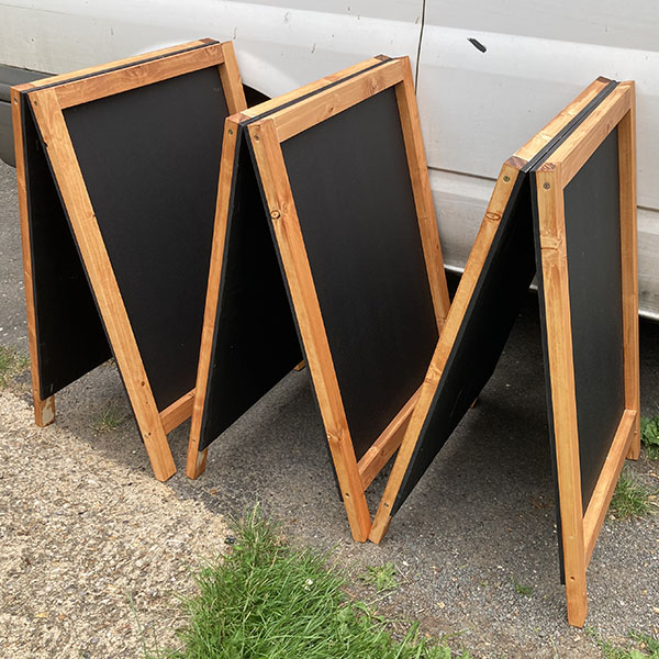 Standard stained A-board. 600mm x 800mm MDF panels framed with 44mm x 27mm timber, stained med oak and matt varnished... complete with brass 'furniture' and metal 'foot-sliders'. Stands 900mm tall x 600mm wide.