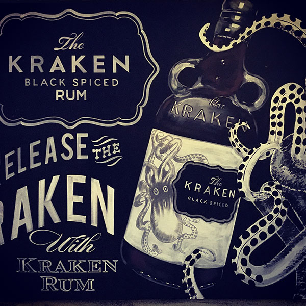 The medium of chalkboard art allows me to throw ideas down quickly, so a quick flick of the brush or two and a swift 'highlight'... and hey presto (hopefully) a 'believable' pint of lager in a shiny glass! I also paint on larger scale projects such as the Kraken mural shown here which was one of several 2meter panels commissioned for a swanky London pub garden... its all good fun... and I don't shy away from adding pretty pictures!>>> Gallery